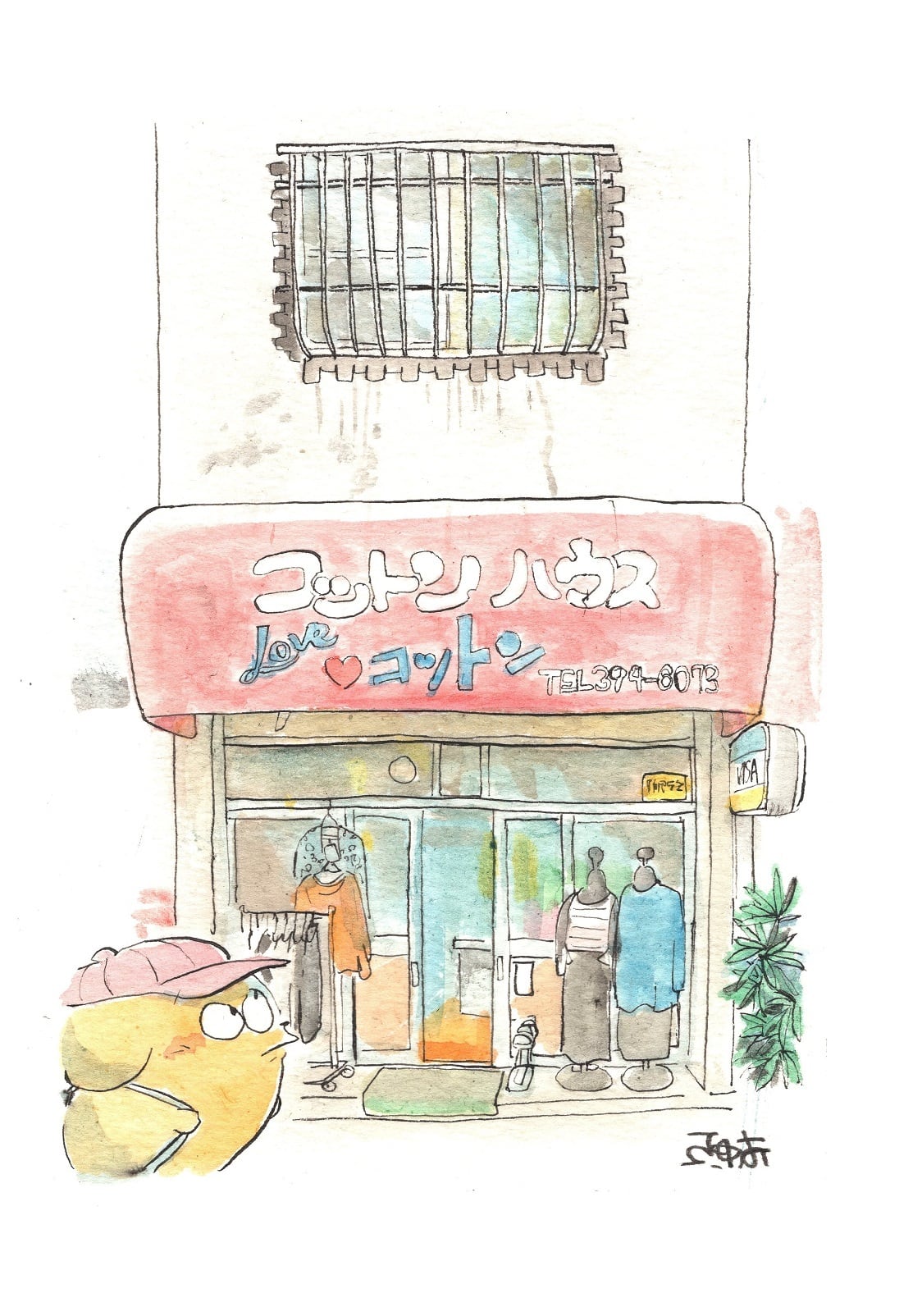 しあわせジョンが服屋の前にいる、1点もの水彩原画です。